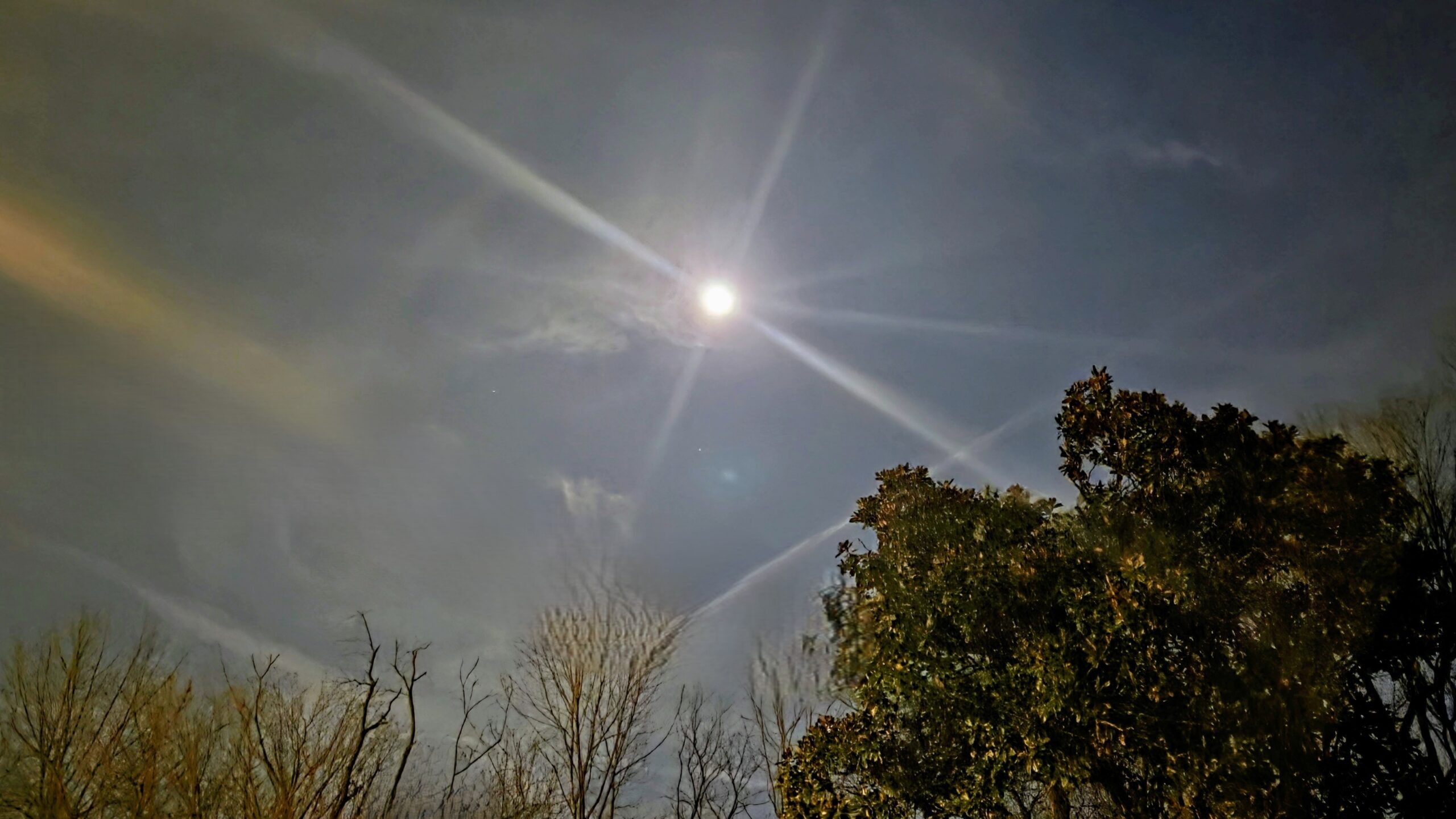 I went out after sunset and happened to look up. Clouds, contrails–I almost missed the picture. As I was taking another picture some minutes later, I glanced again at the moon and saw a different picture.